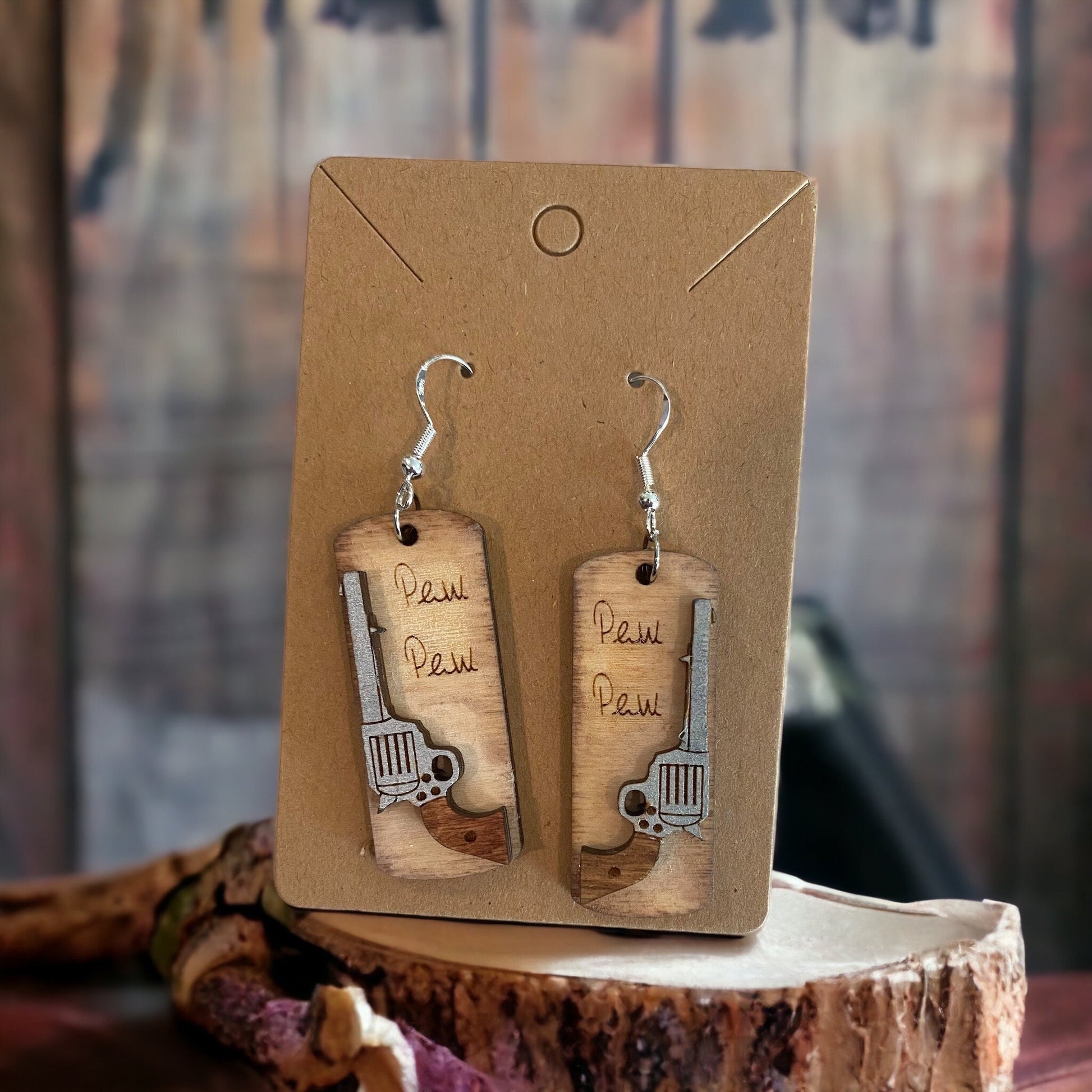 Show off your bold style with these Pistol Pew Pew Birchwood Earrings.